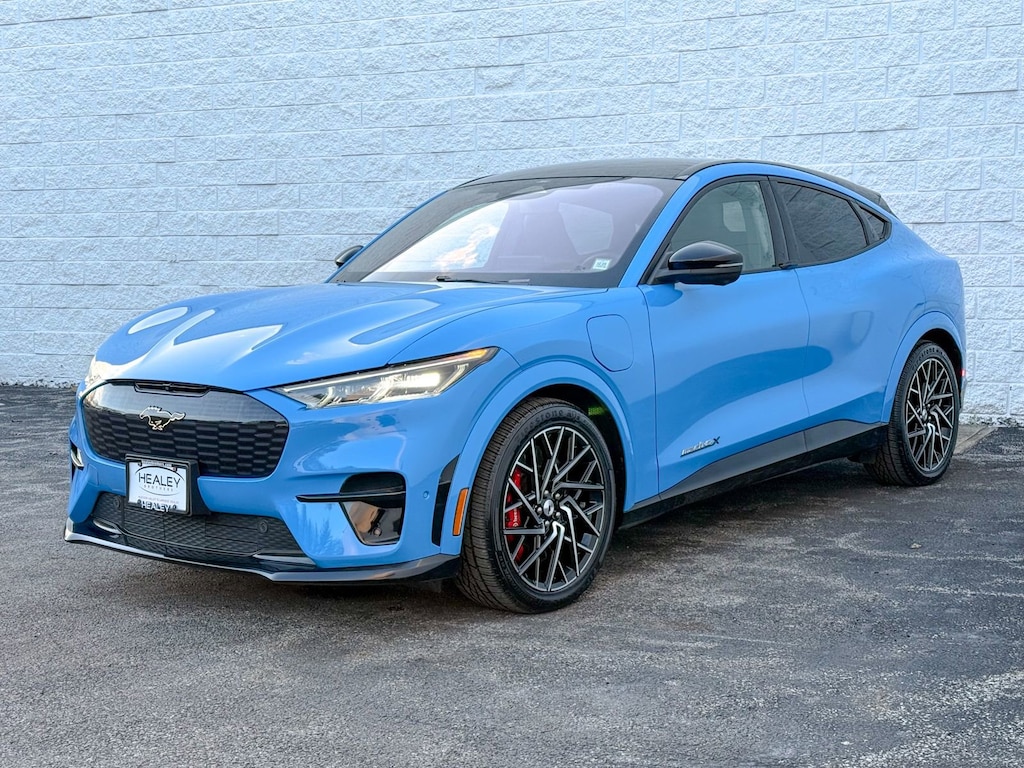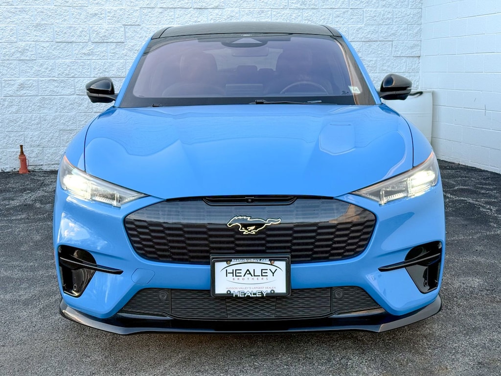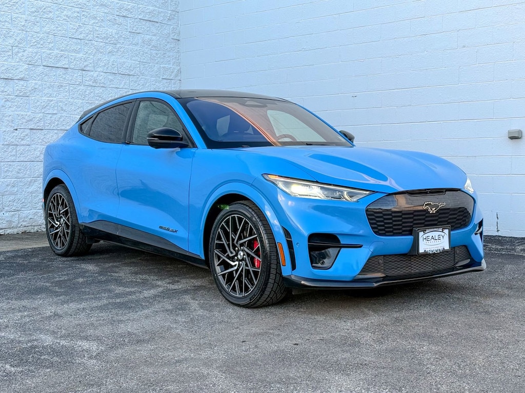 Grabber Blue Metallic 2022 Ford Mustang Mach-E GT AWD Single-Speed Automatic Electric Motor 10 Speakers, 360 Degree Camera, 4-Wheel Disc Brakes, ABS brakes, Active Park Assist 2.0, Air Conditioning, Alloy wheels, Aluminum Applique Instrument Panel w/Unique Design, AM/FM radio: SiriusXM with 360L, AM/FM Stereo, Apple CarPlay/Android Auto, Auto High-beam Headlights, Auto-dimming Rear-View mirror, Automatic temperature control, Axle Ratio: 9.05, BlueCruise Hands-Free Driving, Brake assist, Bumpers: body-color, Cargo Area Protector, Compass, Delay-off headlights, Driver door bin, Driver vanity mirror, Dual front impact airbags, Dual front side impact airbags, Electronic Stability Control, Emergency communication system: 911 Assist, Equipment Group 400A, Exterior Parking Camera Rear, Ford Co-Pilot360 Active 2.0, Four wheel independent suspension, Front & Rear Floor Liners, Front anti-roll bar, Front Bucket Seats, Front Center Armrest, Front dual zone A/C, Front reading lights, Fully automatic headlights, Garage door transmitter, GT Performance Edition, Heated ActiveX Sport Seats, Heated door mirrors, Heated front seats, Heated Perforated ActiveX Performance Seats, Heated steering wheel, Illuminated entry, Interior Protection Package (Pre-Installed), Knee airbag, Low tire pressure warning, MagneRide Dampening System, Memory seat, Navigation system: Connected Navigation, Occupant sensing airbag, Outside temperature display, Overhead airbag, Overhead console, Panic alarm, Panoramic Fixed-Glass Roof, Passenger door bin, Passenger vanity mirror, Power door mirrors, Power driver seat, Power Liftgate, Power passenger seat, Power steering, Power windows, Radio data system, Rain sensing wipers, Rear anti-roll bar, Rear seat center armrest, Rear side impact airbag, Rear window defroster, Rear window wiper, Remote keyless entry, Security system, SiriusXM Radio w/360L, Speed control, Speed-sensing steering, Speed-Sensitive Wipers, Split folding rear seat, Spoiler, Steering wheel mounted audio controls, SYNC 4A w/Enhanced Voice Recognition, Telescoping steering wheel, Tilt steering wheel, Traction control, Trip computer, Turn signal indicator mirrors, Variably intermittent wipers, Wheels: 20 Machined Face Aluminum, Wheels: 20 Machined-Face Aluminum.