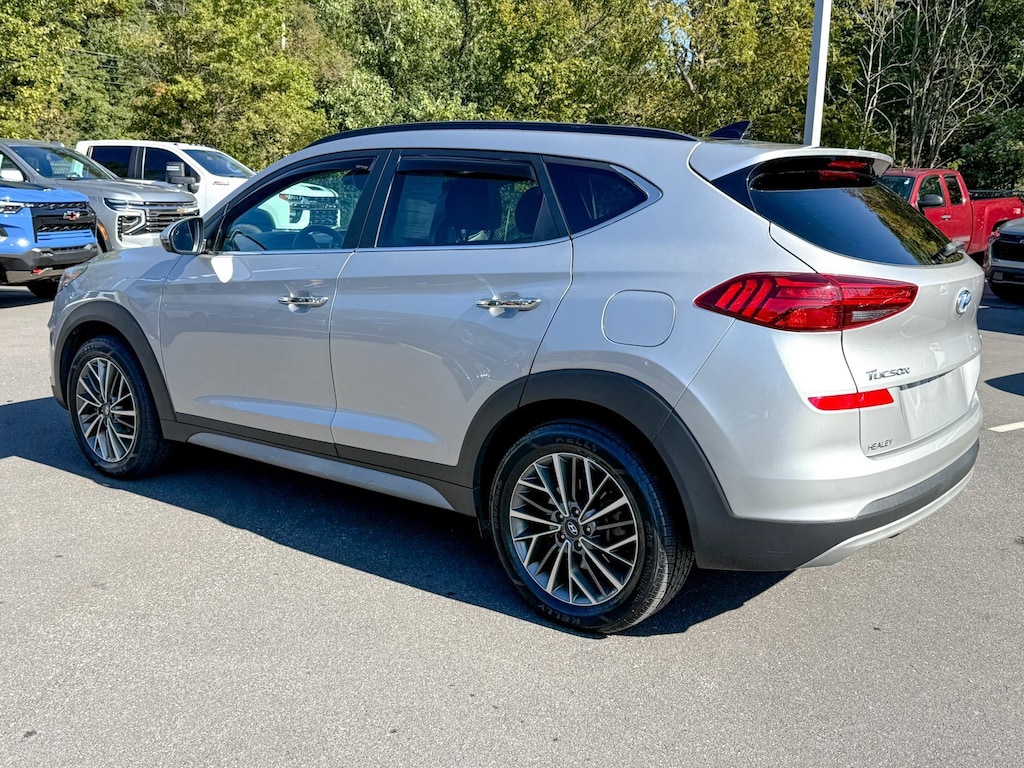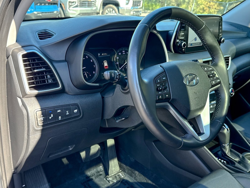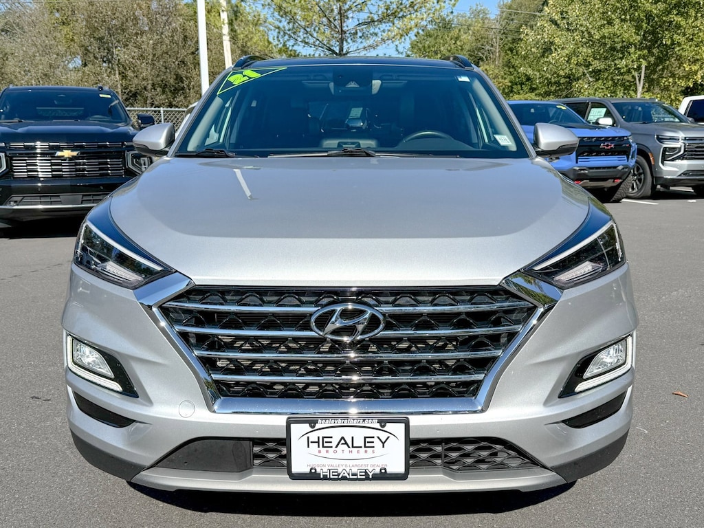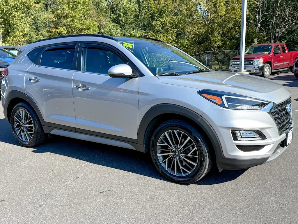 Stellar Silver 2021 Hyundai Tucson Ultimate AWD 6-Speed Automatic with Shiftronic 2.4L I4 DGI DOHC 16V Power moonroof, 18 x 7.0J Alloy Wheels, 4-Wheel Disc Brakes, 8 Speakers, ABS brakes, Air Conditioning, Alloy wheels, AM/FM radio: SiriusXM, Apple CarPlay & Android Auto, Auto High-beam Headlights, Auto-dimming Rear-View mirror, Automatic temperature control, Axle Ratio: 3.195, Brake assist, Bumpers: body-color, Carpeted Floor Mats, Delay-off headlights, Driver door bin, Driver vanity mirror, Dual front impact airbags, Dual front side impact airbags, Electronic Stability Control, Emergency communication system: Blue Link Connected Car Service (3-year complimentary subscription), First Aid Kit, Four wheel independent suspension, Front anti-roll bar, Front Bucket Seats, Front Center Armrest, Front dual zone A/C, Front fog lights, Front reading lights, Fully automatic headlights, Garage door transmitter: HomeLink, Heated & Ventilated Front Bucket Seats, Heated door mirrors, Heated front seats, Heated rear seats, Heated steering wheel, Illuminated entry, Leather Seat Trim, Leather Shift Knob, Low tire pressure warning, Navigation System, Occupant sensing airbag, Option Group 01, Outside temperature display, Overhead airbag, Overhead console, Panic alarm, Passenger door bin, Passenger vanity mirror, Power door mirrors, Power driver seat, Power Liftgate, Power passenger seat, Power steering, Power windows, Radio: Infinity Audio System w/Navigation, Rain sensing wipers, Rear anti-roll bar, Rear reading lights, Rear seat center armrest, Rear window defroster, Rear window wiper, Remote keyless entry, Roof rack: rails only, Security system, Speed control, Speed-sensing steering, Split folding rear seat, Spoiler, Steering wheel mounted audio controls, Tachometer, Telescoping steering wheel, Tilt steering wheel, Traction control, Trip computer, Turn signal indicator mirrors, Variably intermittent wipers, Ventilated front seats, One Owner, Power moonroof.
