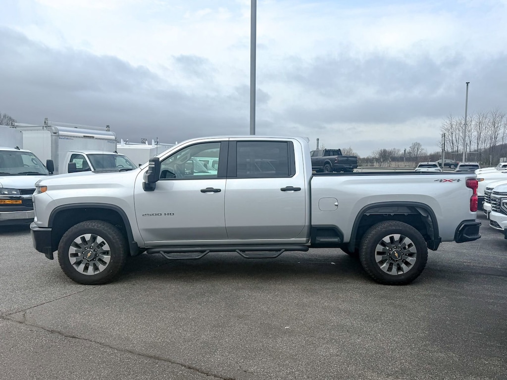 Certified. Silver Ice Metallic 2022 Chevrolet Silverado 2500HD Custom 4WD 6-Speed Automatic 6.6L V8 Custom Convenience Package, 10-Way Power Driver Seat Adjuster w/Lumbar, 120-Volt Bed Mounted Power Outlet, 120-Volt Instrument Panel Power Outlet, 170 Amp Alternator, 2-Speed Electronic Shift Transfer Case, 3.5 Diagonal Monochromatic Display DIC, 3.73 Rear Axle Ratio, 4-Wheel Disc Brakes, 6 Speakers, 6-Speaker Audio System, 720 Cold-Cranking Amps Heavy-Duty Battery, ABS brakes, Air Conditioning, Alloy wheels, AM/FM radio, Apple CarPlay/Android Auto, Black Mirror Caps, Bluetooth® For Phone, Body Color Front Grille, Brake assist, Cloth Seat Trim, Color-Keyed Carpeting Floor Covering, Deep-Tinted Glass, Delay-off headlights, Driver door bin, Dual front impact airbags, Dual front side impact airbags, Electric Rear-Window Defogger, Electronic Cruise Control w/Set & Resume Speed, Electronic Stability Control, EZ Lift Power Lock & Release Tailgate, Front 40/20/40 Split-Bench Seats, Front anti-roll bar, Front Center Armrest w/Storage, Front License Plate Kit, Front reading lights, Front Rubberized Vinyl Floor Mats, Front wheel independent suspension, Fully automatic headlights, Heated door mirrors, Heated Vertical Trailering Mirrors, Illuminated entry, Integrated Trailer Brake Controller, LED Cargo Area Lighting, Locking Tailgate, Low tire pressure warning, Manual Tailgate Function w/No EZ Lift, Manual Tilt-Wheel Steering Column, Occupant sensing airbag, Outside temperature display, Overhead airbag, Overhead console, Panic alarm, Passenger door bin, Passenger vanity mirror, Power Door Locks, Power door mirrors, Power Front Windows w/Driver Express Up/Down, Power Front Windows w/Passenger Express Down, Power Rear Windows w/Express Down, Power steering, Power windows, Preferred Equipment Group 1CX, Premium audio system: Chevrolet Infotainment 3, Radio: Chevrolet Infotainment 3 System, Rear 60/40 Folding Bench Seat (Folds Up), Rear reading lights, Rear Rubberized Vinyl Floor Mats, Rear step bumper, Remote Keyless Entry, Remote keyless entry, Remote Vehicle Starter System, Speed control, Split folding rear seat, Standard Tailgate, Suspension Package, Tachometer, Tilt steering wheel, Traction control, Trip computer, Turn signal indicator mirrors, Variably intermittent wipers, Voltmeter, Wheels: 20 10-Spoke Machined Aluminum, Custom Convenience Package.