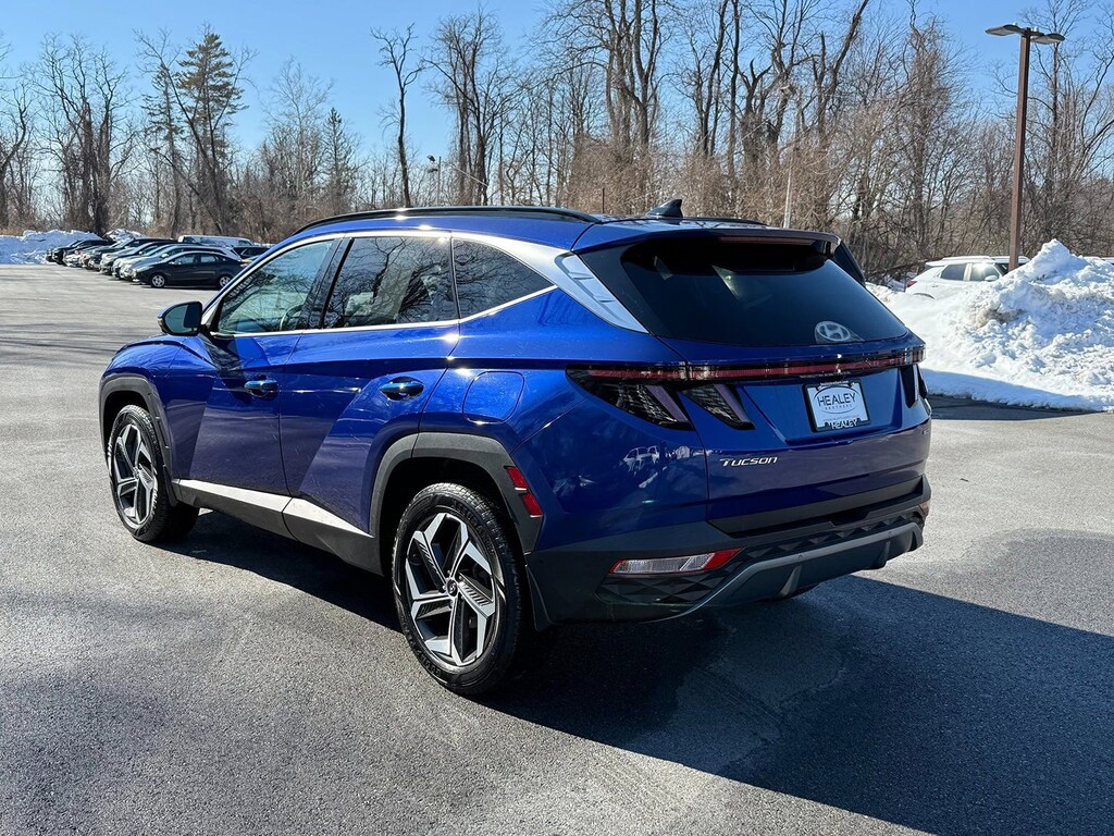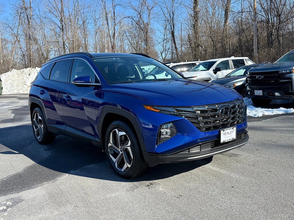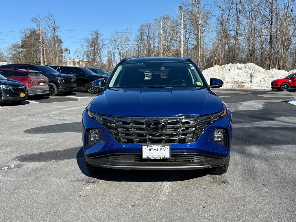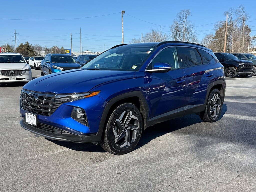 Certified. Intense Blue 2023 Hyundai Tucson Limited AWD 8-Speed Automatic with SHIFTRONIC 2.5L I4 DGI DOHC 16V LEV3-ULEV70 187hp 3.648 Axle Ratio, 4-Wheel Disc Brakes, 8 Speakers, ABS brakes, Air Conditioning, Alloy wheels, AM/FM radio: SiriusXM, Apple CarPlay & Android Auto, Auto High-beam Headlights, Auto-dimming Rear-View mirror, Automatic temperature control, Brake assist, Bumpers: body-color, Cargo Cover, Cargo Net, Cargo Tray, Carpeted Floor Mats, Delay-off headlights, Driver door bin, Driver vanity mirror, Dual front impact airbags, Dual front side impact airbags, Electronic Stability Control, Emergency communication system: Blue Link Connected Car Service (3-year complimentary subscription), Four wheel independent suspension, Front and Rear Mudguards, Front anti-roll bar, Front Bucket Seats, Front Center Armrest, Front dual zone A/C, Front reading lights, Fully automatic headlights, Garage door transmitter: HomeLink, Heated & Ventilated Front Bucket Seats, Heated door mirrors, Heated front seats, Heated rear seats, Heated steering wheel, Illuminated entry, Leather Seat Trim, Low tire pressure warning, Memory seat, Navigation System, Occupant sensing airbag, Option Group 01, Outside temperature display, Overhead airbag, Overhead console, Panic alarm, Passenger door bin, Passenger vanity mirror, Power door mirrors, Power driver seat, Power Liftgate, Power moonroof, Power passenger seat, Power steering, Power windows, Radio data system, Radio: Bose Premium w/AM/FM/HD/SiriusXM Audio System, Rain sensing wipers, Rear anti-roll bar, Rear Bumper Applique, Rear reading lights, Rear seat center armrest, Rear window defroster, Rear window wiper, Remote keyless entry, Roof rack: rails only, Security system, Speed control, Split folding rear seat, Spoiler, Steering wheel mounted audio controls, Tachometer, Telescoping steering wheel, Tilt steering wheel, Traction control, Trip computer, Turn signal indicator mirrors, Variably intermittent wipers, Ventilated front seats, Wheel Locks, Wheels: 19 x 7.5J Machine-Face Finish Alloy.